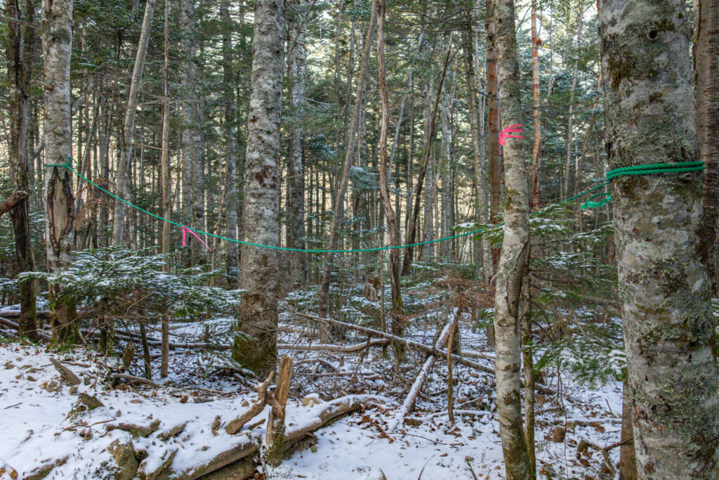 南壁取り付きは、黄色テープと黒テープが巻かれている立ち木が目印です。