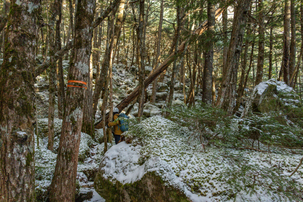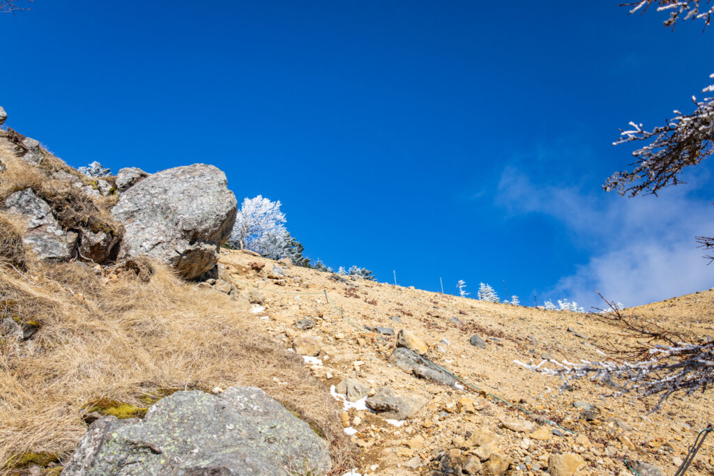 しらびそ小屋から進んでいくと、登山道沿いに緑ロープが巻かれている箇所が南壁取り付きへの入口です。