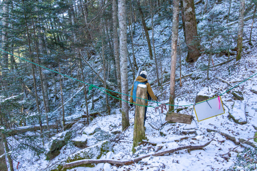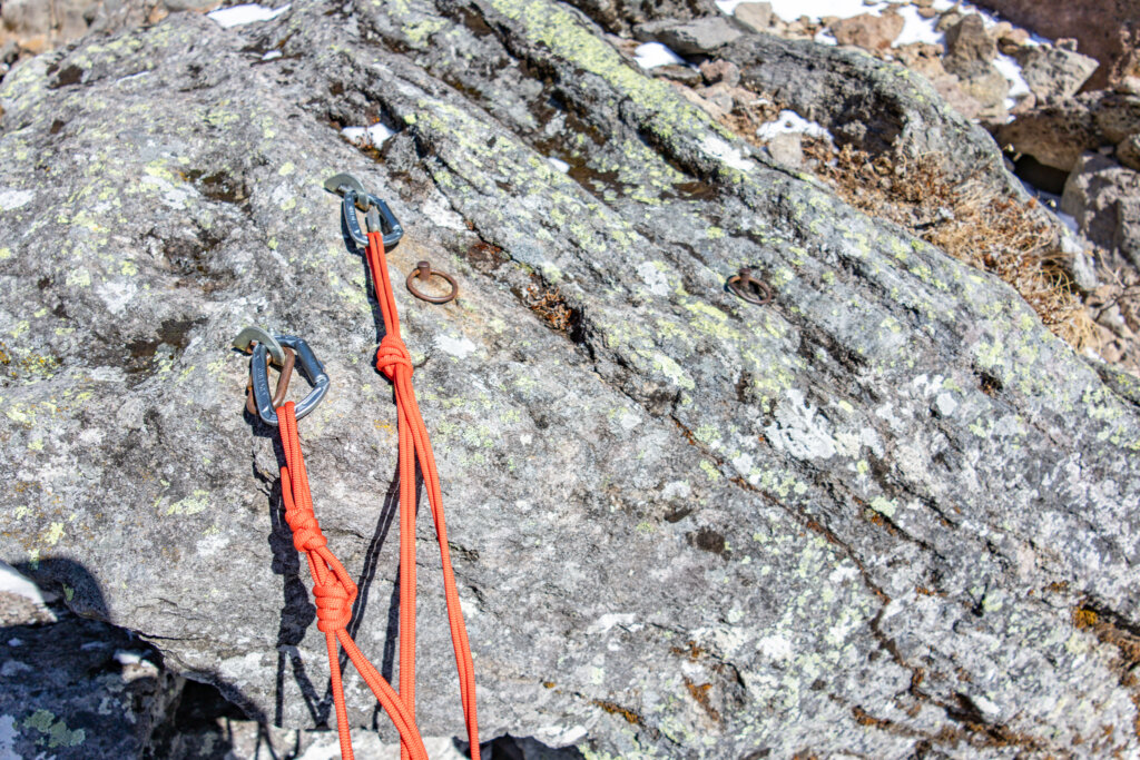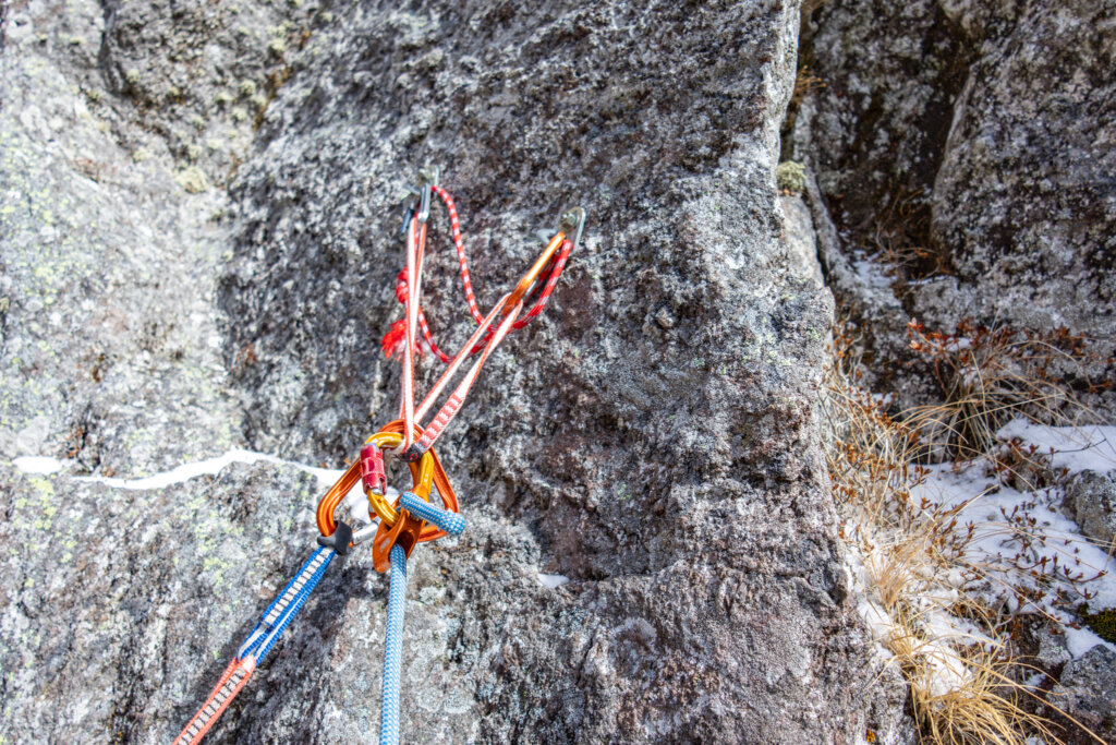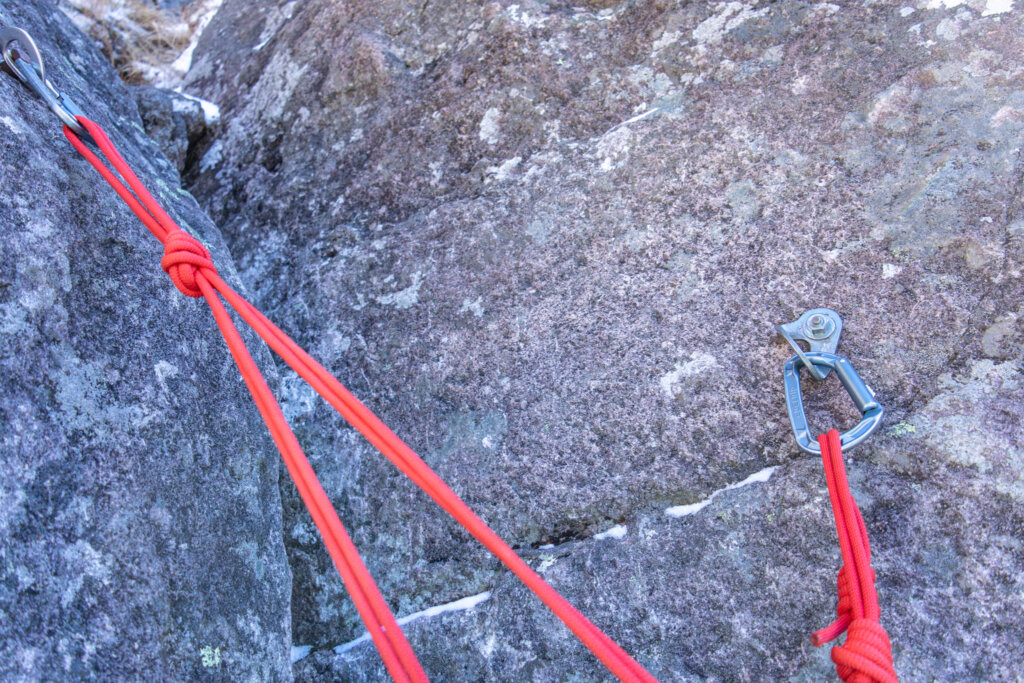 上部には大きな岩が多くあるので、どれかを使ってスリングで支点を取ります。