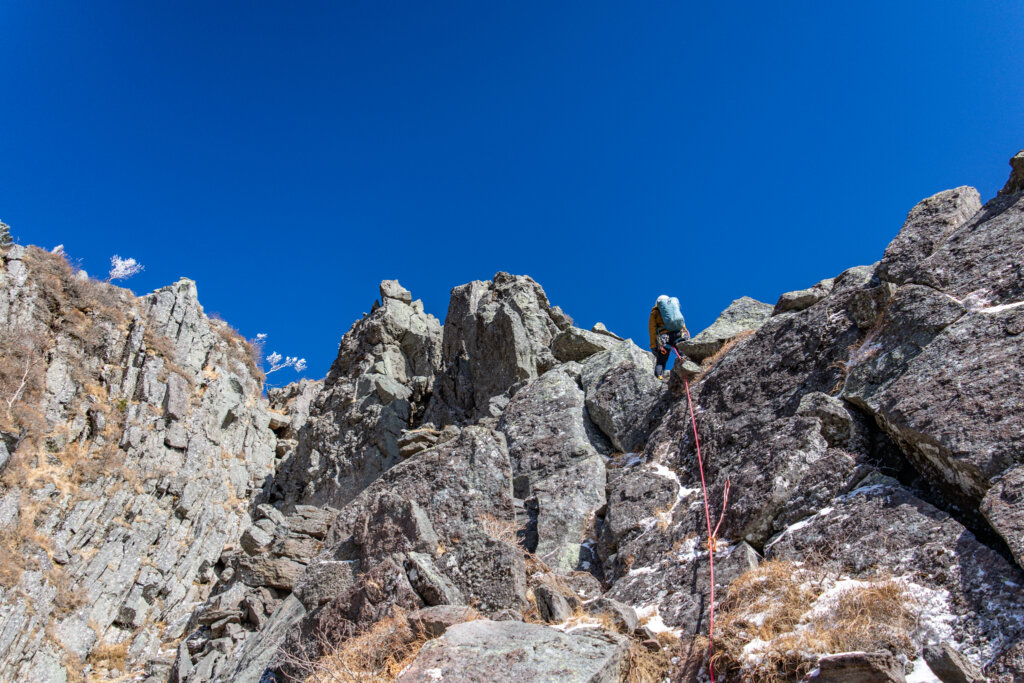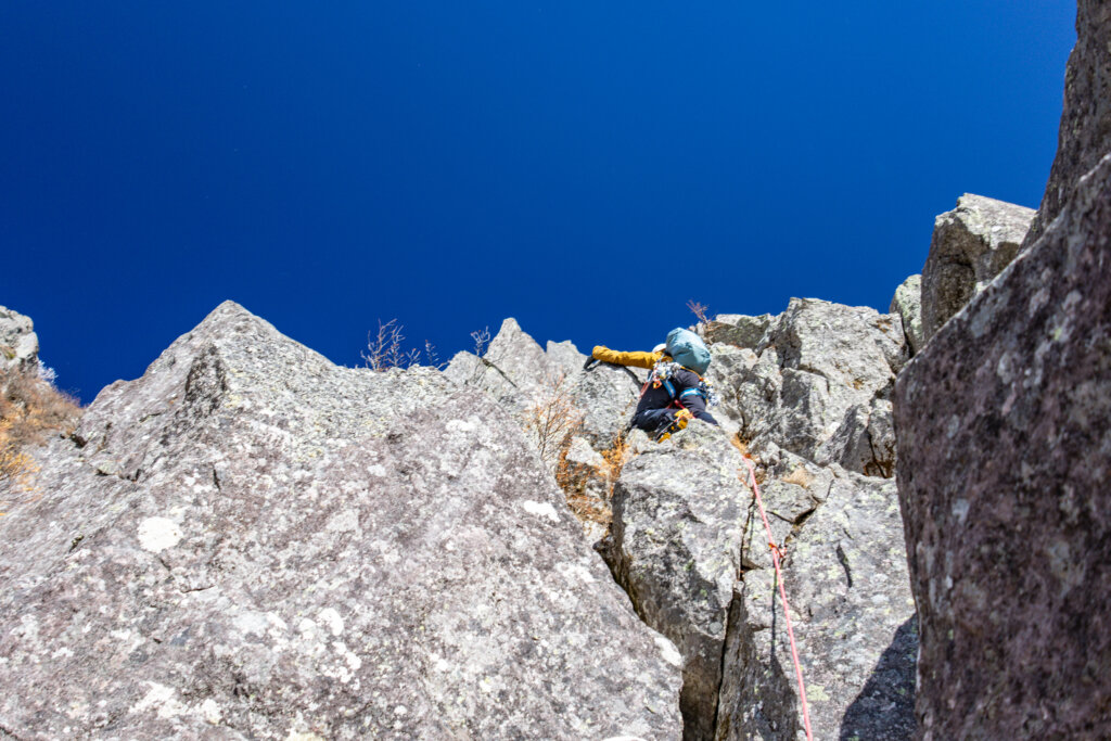 5ピッチ目はAさんリード。比較的緩やかな岩稜帯を登ってから左側に巻いていくと終了点があります。