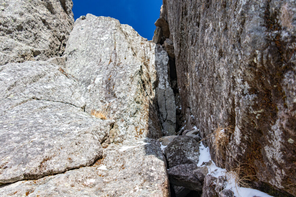 写真からだと分かりづらいですが、チムニー上部は横壁に脚を押さえつけて登る箇所があるので、アイゼンだと結構登りづらいです。