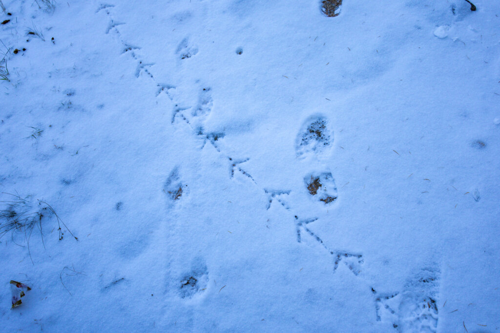 途中で鳥の足跡を観察しつつ、みどり池登山口まで戻ります。